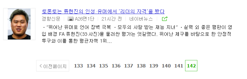 페이지 마지막 숫자가 142였다. 1페이지에 기사 10개 링크가 걸리니 1410개에다 마지막 페이지에 기사 7개가 있었다. 무려 1417개.